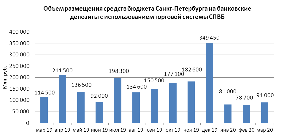 В марте 2020 года объем размещения средств бюджета Санкт-Петербурга на депозиты в уполномоченных банках с использованием торговой системы СПВБ составил 91,000 млрд. руб., в феврале 2020 года – 78,700 млрд. руб.
