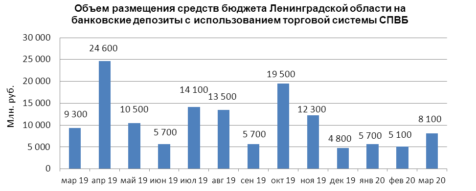 В марте 2020 г. объем размещения средств бюджета Ленинградской области на банковские депозиты в уполномоченных банках с использованием торговой системы СПВБ составил 8,100 млрд. руб., в феврале 2020 года - 5,100 млрд. руб.