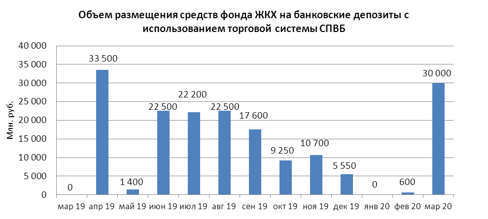 В марте 2020 года объем размещения временно свободных средств государственной корпорации - Фонд содействия реформированию жилищно-коммунального хозяйства на депозиты в уполномоченных банках с использованием торговой системы СПВБ составил 30,000 млрд. руб., в феврале 2020 года - 0,600 млрд. руб.