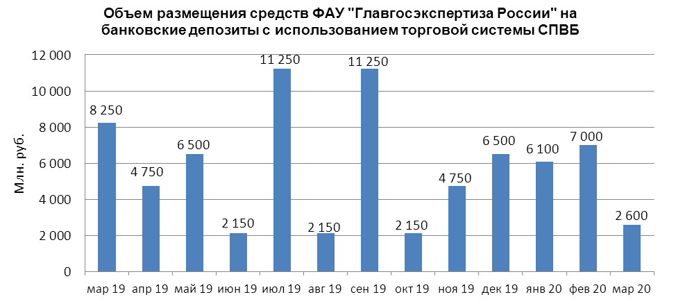В марте 2020 г. объем размещения средств ФАУ «Главгосэкспертиза России» на банковские депозиты в уполномоченных банках составил 2,600 млрд. руб., в феврале 2020 года - 7,000 млрд. руб.