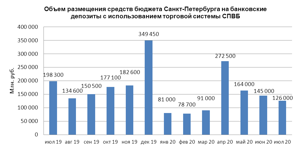 В июле 2020 года объем размещения средств бюджета Санкт-Петербурга на депозиты в уполномоченных банках с использованием торговой системы СПВБ составил 126,000 млрд. руб., в июне 2020 года – 145,000 млрд. руб.
