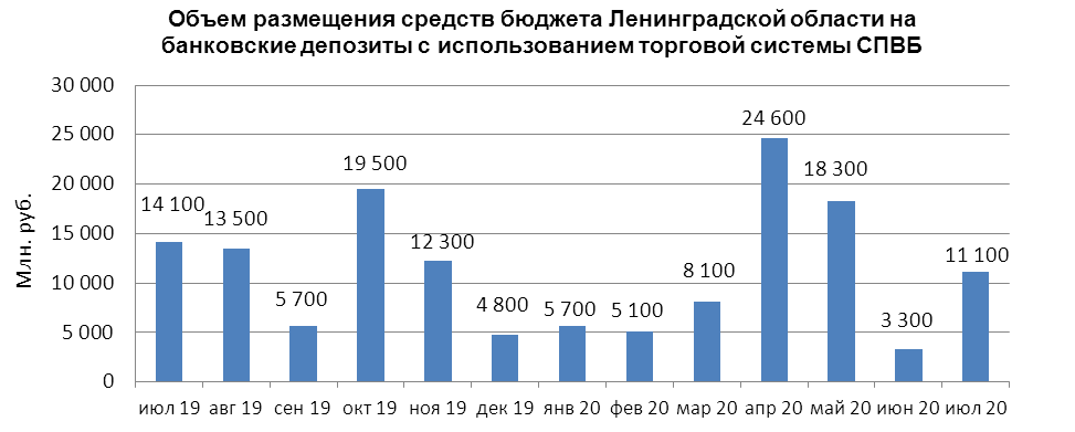 В июле 2020 г. объем размещения средств бюджета Ленинградской области на банковские депозиты в уполномоченных банках с использованием торговой системы СПВБ составил 11,100 млрд. руб., в июне 2020 года - 3,300 млрд. руб.