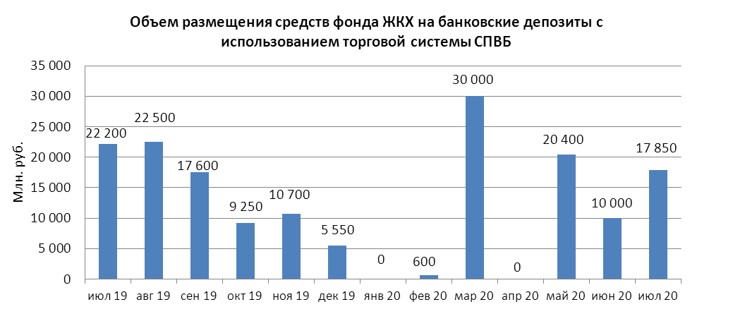 В июле 2020 года объем размещения временно свободных средств государственной корпорации - Фонд содействия реформированию жилищно-коммунального хозяйства на депозиты в уполномоченных банках с использованием торговой системы СПВБ составил 17,850 млрд. руб., в июне 2020 года - 10,000 млрд. руб.