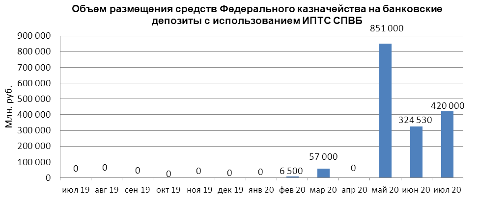 В июле 2020 г. объем размещения средств федерального бюджета на банковские депозиты, осуществленного Федеральным казначейством с использованием информационных программно-технических средств СПВБ, составил 420,000 млрд. руб., в июне 2020 года - 324,530 млрд. руб.