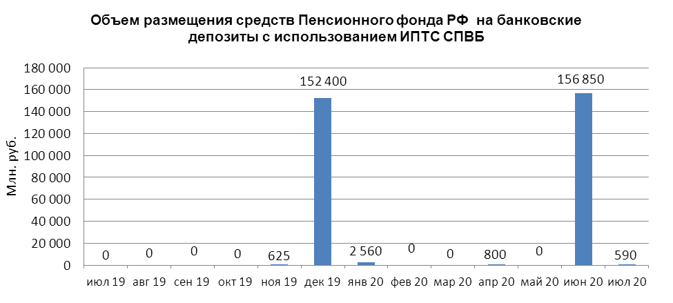 В июле 2020 г. объем размещения средств Пенсионного фонда Российской Федерации на банковские депозиты, осуществленного Пенсионным фондом с использованием информационных программно-технических средств СПВБ, составил 0,590 млрд. руб., в июне 2020 года - 156,850 млрд. руб.