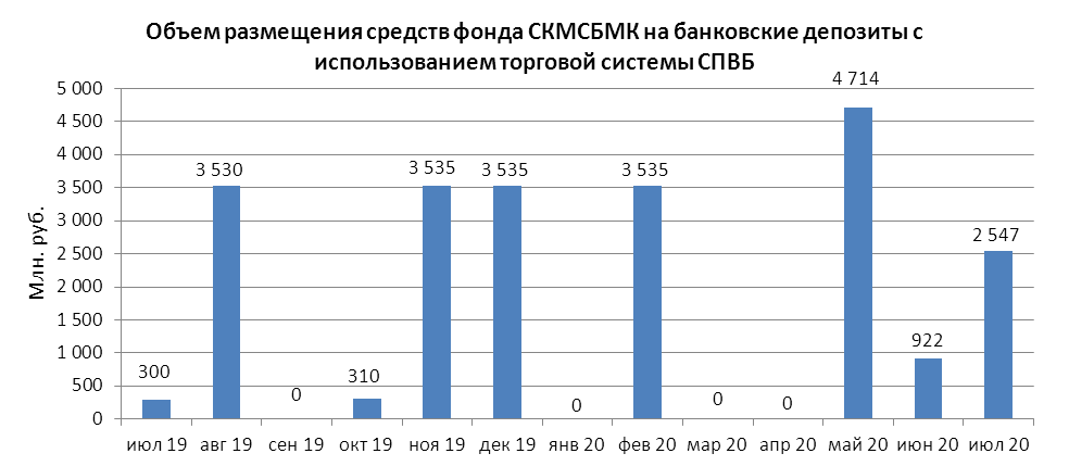 Объем размещения временно свободных средств некоммерческой организации “Фонд содействия кредитованию малого и среднего бизнеса, микрокредитная компания” на банковские депозиты в уполномоченных банках с использованием торговой системы СПВБ в июле 2020 года составил 2,547 млрд. руб., в июне 2020 года - 0,922 млрд. руб.