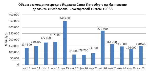 В августе 2020 года объем размещения средств бюджета Санкт-Петербурга на депозиты в уполномоченных банках с использованием торговой системы СПВБ составил 150,500 млрд. руб., в июле 2020 года - 126,000 млрд. руб.
