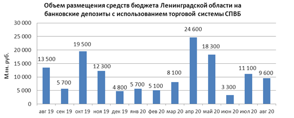 В августе 2020 г. объем размещения средств бюджета Ленинградской области на банковские депозиты в уполномоченных банках с использованием торговой системы СПВБ составил 9,600 млрд. руб., в июле 2020 года - 11,100 млрд. руб.