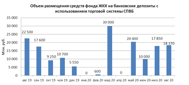 В августе 2020 года объем размещения временно свободных средств государственной корпорации - Фонд содействия реформированию жилищно-коммунального хозяйства на депозиты в уполномоченных банках с использованием торговой системы СПВБ составил 18,370 млрд. руб., в июле 2020 года - 17,850 млрд. руб.