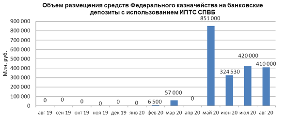 В августе 2020 г. объем размещения средств федерального бюджета на банковские депозиты, осуществленного Федеральным казначейством с использованием информационных программно-технических средств СПВБ, составил 410,000 млрд. руб., в июле 2020 года - 420,000 млрд. руб.