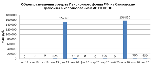 В августе 2020 г. объем размещения средств Пенсионного фонда Российской Федерации на банковские депозиты, осуществленного Пенсионным фондом с использованием информационных программно-технических средств СПВБ, составил 0,430 млрд. руб., в июле 2020 года - 0,590 млрд. руб.
