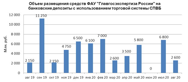 В августе 2020 г. объем размещения средств ФАУ «Главгосэкспертиза России» на банковские депозиты в уполномоченных банках составил 2,600 млрд. руб., в июле 2020 года - 6,800 млрд. руб.