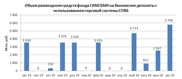 Объем размещения временно свободных средств некоммерческой организации “Фонд содействия кредитованию малого и среднего бизнеса, микрокредитная компания” на банковские депозиты в уполномоченных банках с использованием торговой системы СПВБ в августе 2020 года составил 5,790 млрд. руб., в июле 2020 года - 2,547 млрд. руб.